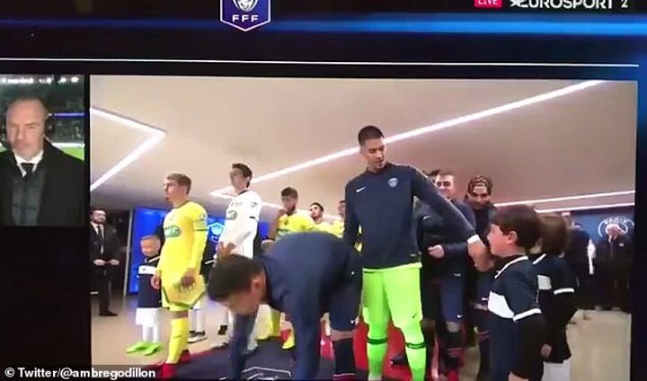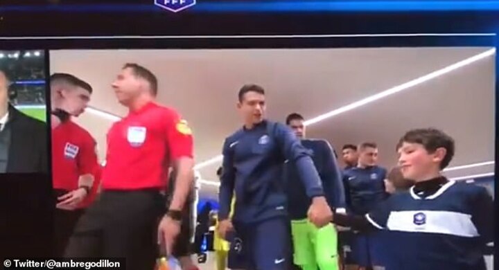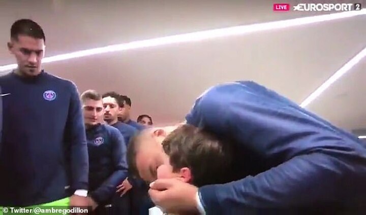 A young mascot was overcome with emotion as he prepared to walk out with the Paris Saint-Germain squad before Mbappe stepped in to try and raise his spirits and put a smile back on his face.
