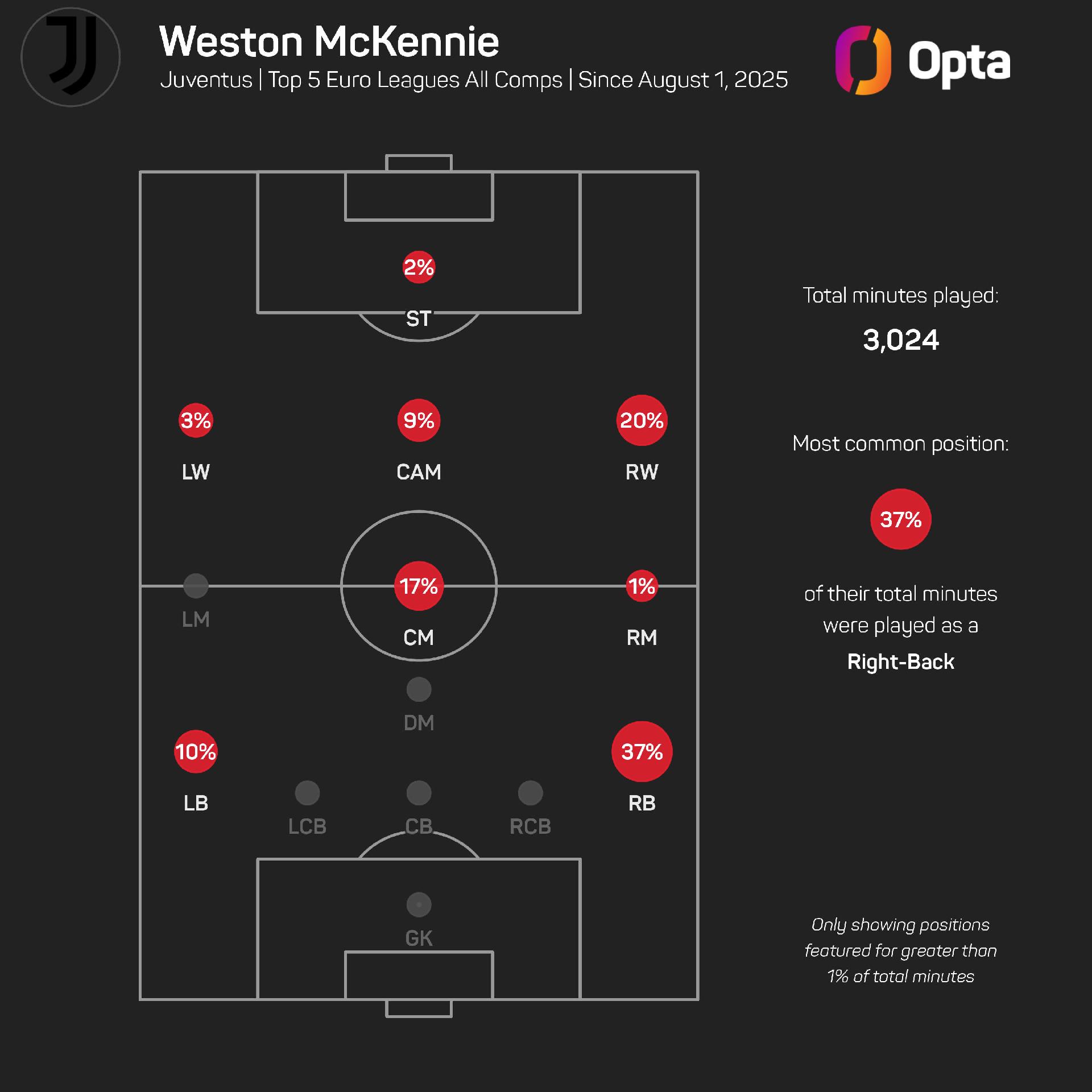 The USA star has also played 9% of his minutes in a number 10 role, 3% on the left wing, and 2% as a striker, supporting Jonathan David up front in Juve's most recent match, a 3-3 Serie A draw with Roma on Sunday.