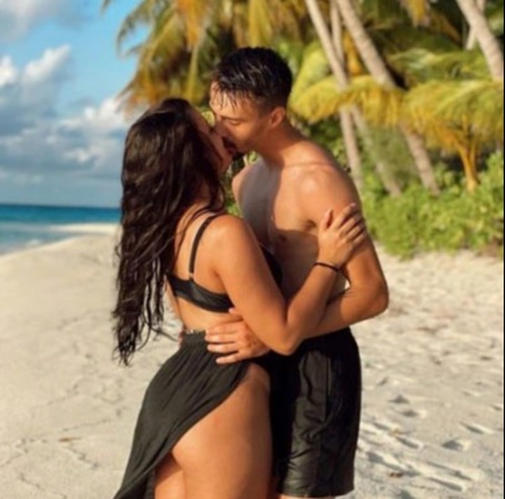 The loved-up pair shared a photo on the beach in the Maldives having an intimate kiss.