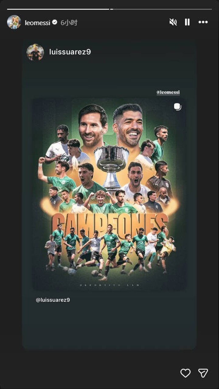 Not long ago, Suarez and Messi posted on social media to celebrate their team LSM winning the league title and achieving promotion.