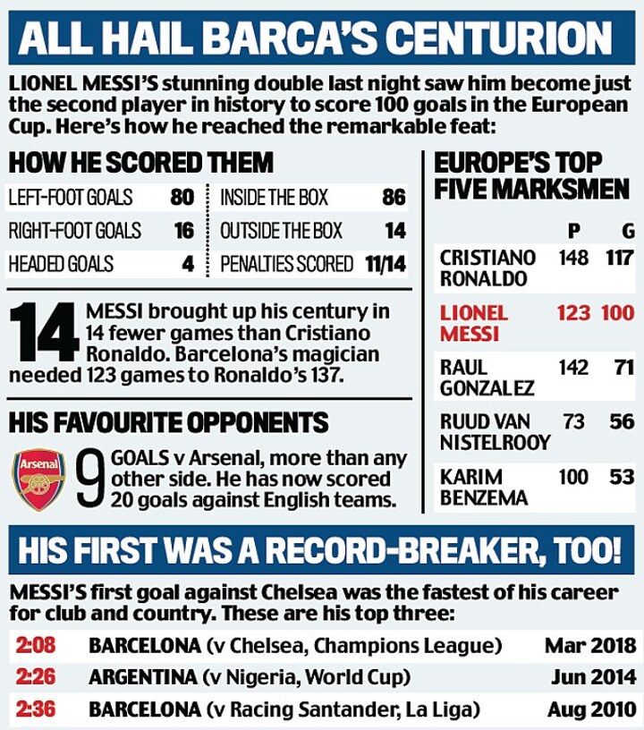 Messi's second goal against Chelsea, in the 63rd-minute, brought up his century in the Champions League and it has taken him 123 matches to reach the milestone.