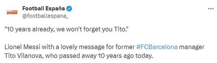 On Thursday Messi posted an Instagram story with a picture of him and Vilanova along with the message: '10 years already, we won't forget you Tito.'