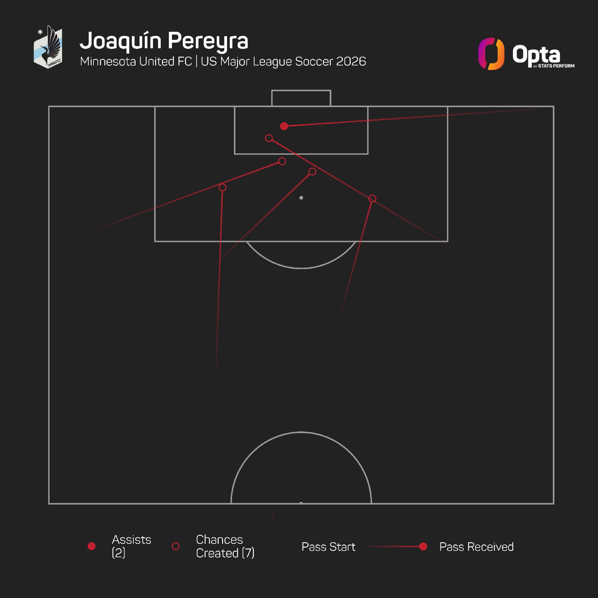 Pereyra has created more chances (seven) than any other player for the Loons, while he also has two goal contributions, level with Kelvin Yeboah for the most for Minnesota.