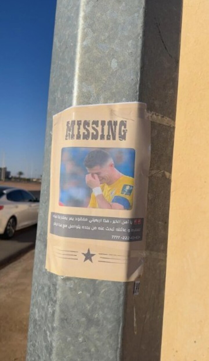 Posters mocking Cristiano Ronaldo have appeared on the streets of Saudi Arabia, reading: "Kind people, this is a missing man in his 40s suffering from excessive crying syndrome. His family is looking for him. If you find him, please call..."