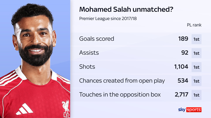 Salah ranks top in that timeframe for goals, assists, shots, open-play chances created and touches in the opposition box, the competition's outstanding scorer and creator.