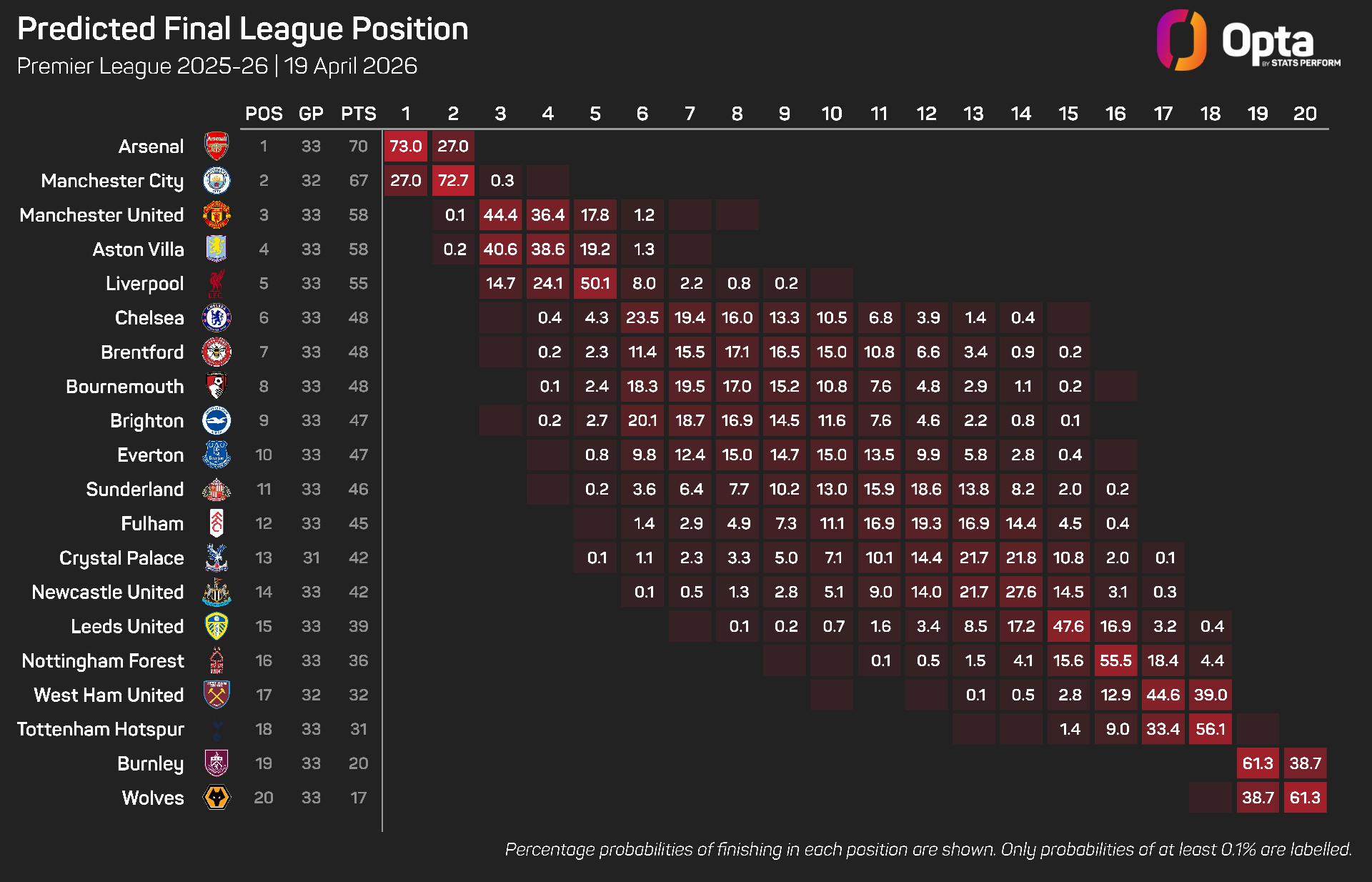 The Opta supercomputer still has Arsenal as favourites to win the title, winning 73% of its season simulations, though City's probability has now jumped up to 27%.