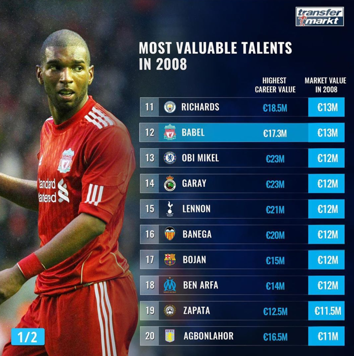 Former Liverpool winger Babel is ranked 12th. Bojan Krkic sits 17th.