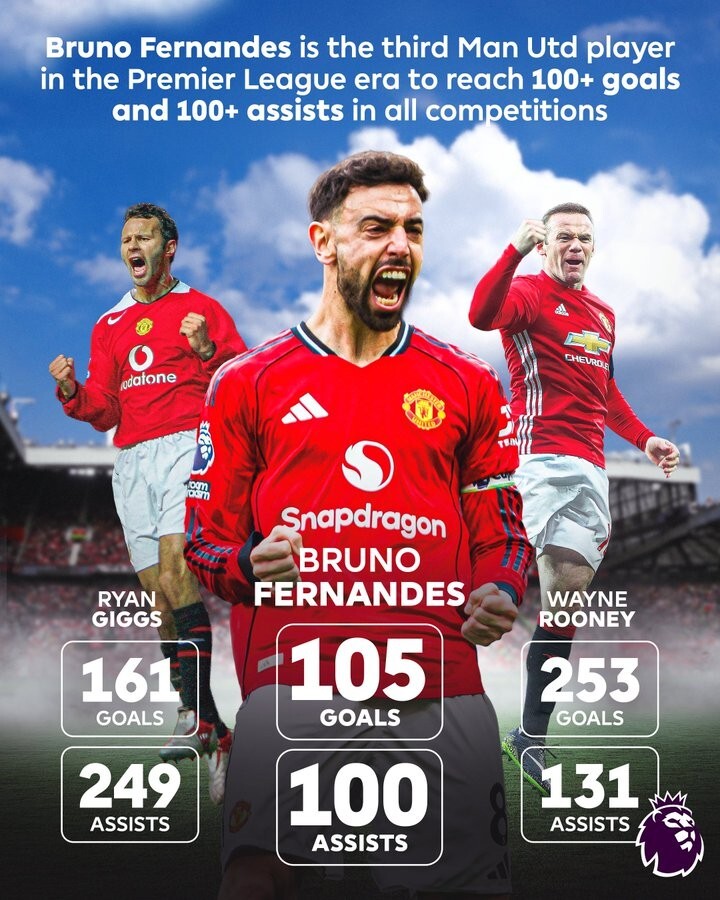 Bruno Fernandes is the third Man Utd player in the Premier League era to reach 100+ goals and 100+ assists in all competitions.