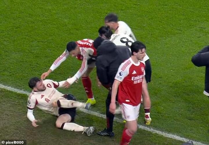 When Bradley didn't, Martinelli shoved the Northern Irishman to try and get him off the field, seemingly causing more pain as Liverpool players saw red.