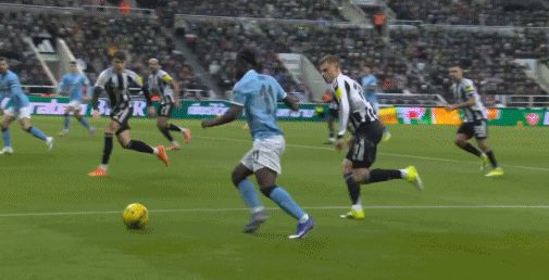75' Bruno Guimarães is booked for a foul on Jeremy Doku