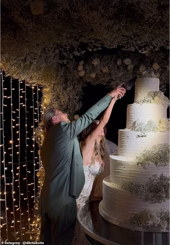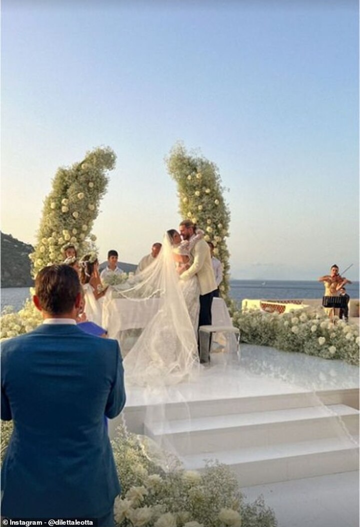 The extravagant ceremony on the island of Vulcano was watched on by 160 guests including the likes of Elisabetta Canalis, Michelle Hunziker, and Elodie and Eleonora Berlusconi.