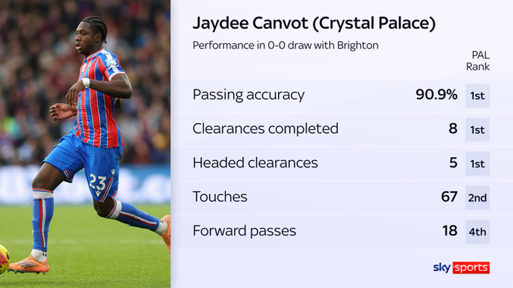 The 19-year-old was excellent throughout, showing confidence and commanding play in Guehi's absence. He ranked top for passing in Palace's team, while he also showed his excellent reading of the game in his clearance numbers.