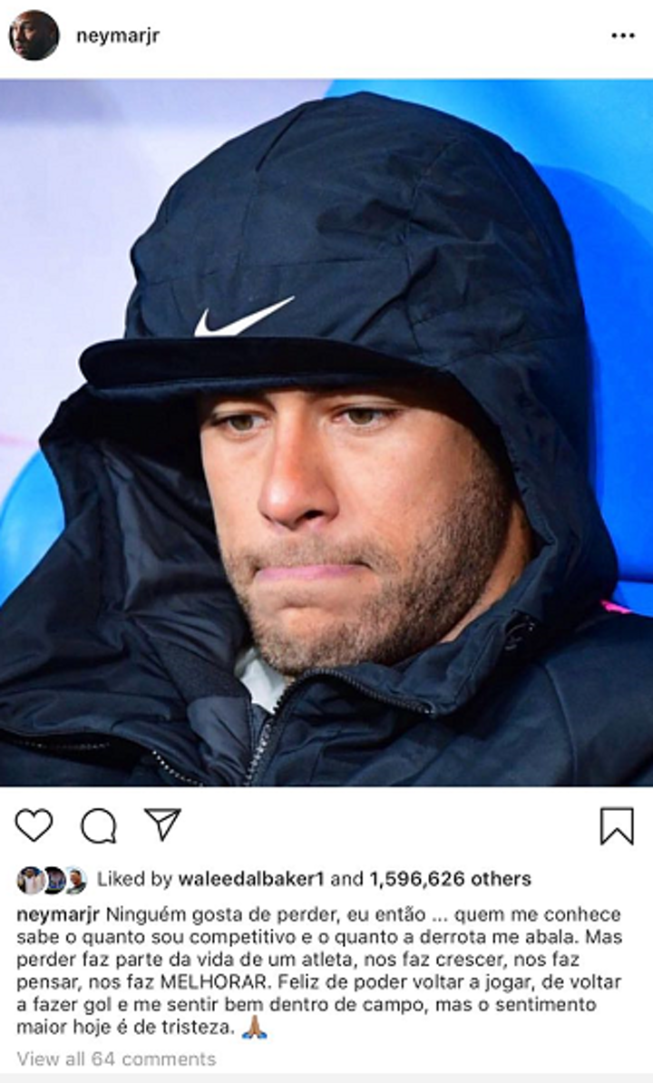 The image showed Neymar looking sad with his hood up but the post did not reference the incident on the steps up to collect his runners up medal.