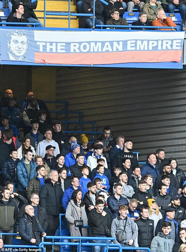 However, fans still displayed a 'Roman Empire' Abramovich banner in support of their oligarch owner with links to Russian tyrant Putin, who has been accused on war crimes during his invasion of Ukraine.
