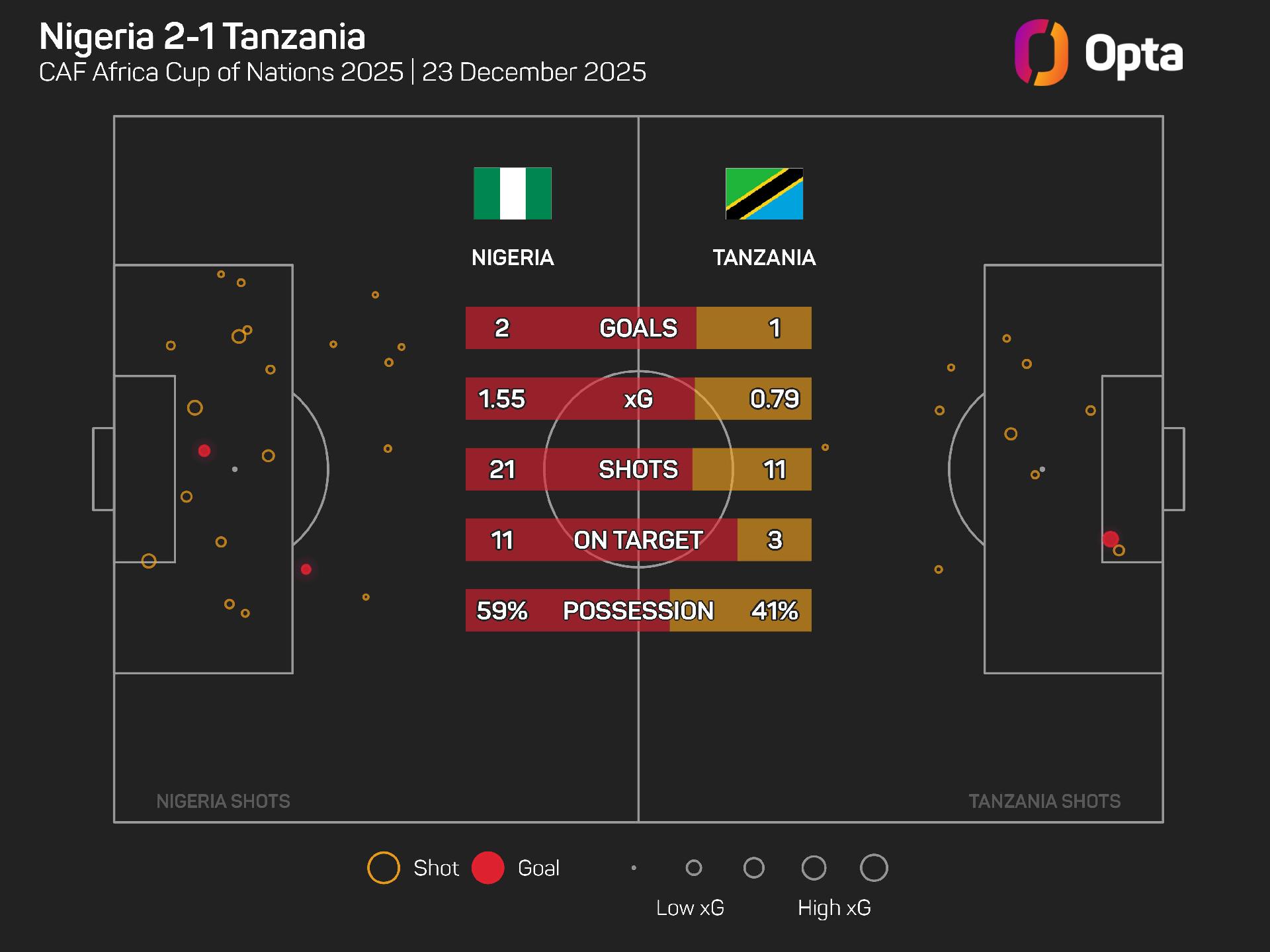 Tanzania gave a good account of themselves, ending the game with 0.79 expected goals (xG) from 11 shots, compared to Nigeria's 21 shots and 1.55 xG.