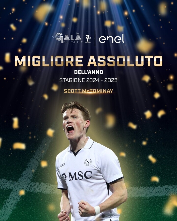 At the awards ceremony of the 2025 Italy Football Gala, Napoli's midfield star, Scott McTominay, was elected the best player of the 2024-25 season.