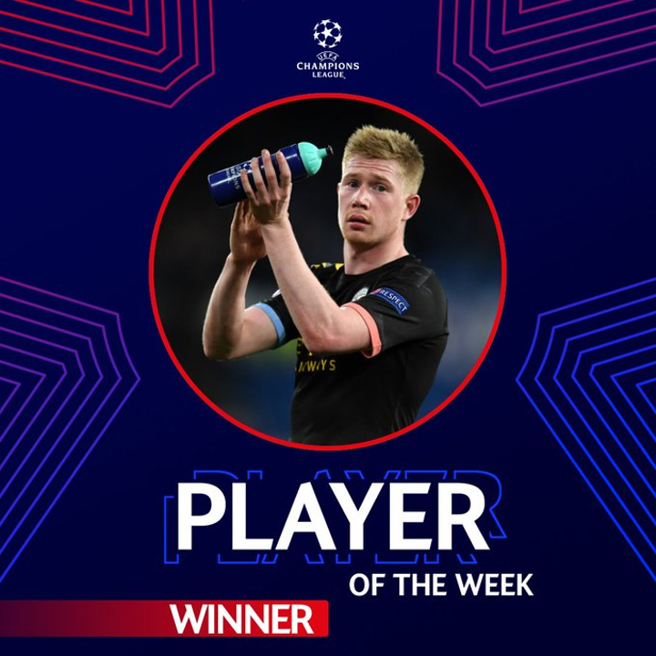 Man City playmaker Kevin De Bruyne has been named Champions League Player of the Week with a goal and an assist in the first leg against Real Madrid.