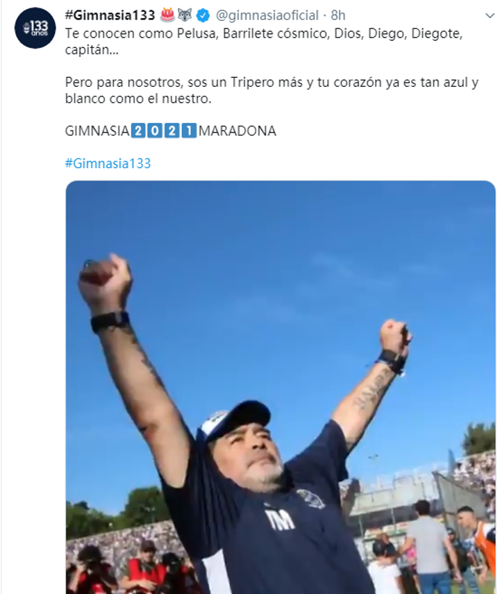 "But to us you are another Tripero and your heart is already as white and blue as ours is. Gimnasia 2021 Maradona."