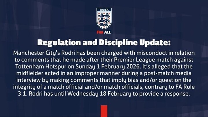 Manchester City's Rodri has been charged with misconduct in relation to comments that he made after their Premier League Match against Tottenham Hotspur on Sunday 1 February 2026. It's alleged that the midfielder acted in an improper manner during a post-match media interview by making comments that imply bias and/or question the integrity of a match official and/or match officials, contrary to FA Rule 3.1. Rodri has until Wednesday 18 February to provide a response.