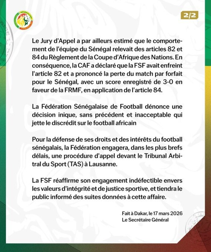 The Senegalese Football Federation (FSF) has today been notified of the decision rendered on March 17, 2026, by the Appeals Board of the Confederation of African Football (CAF), in case DC23316. This procedure follows the complaint filed during match number 52 of the TotalEnergies Africa Cup of Nations (AFCON), Morocco 2025, between Senegal and Morocco.