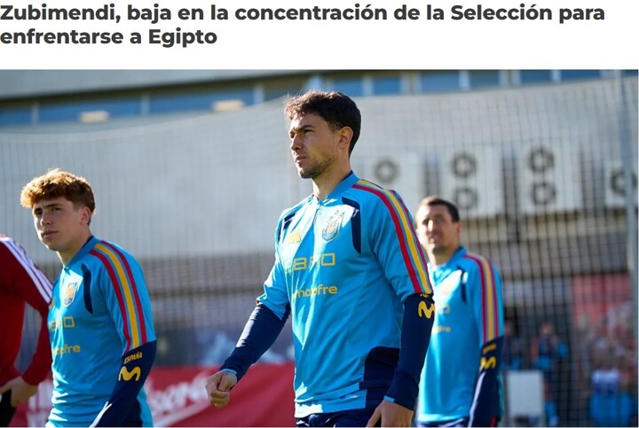 Martin Zubimendi has withdrawn from the Spanish national team training camp due to discomfort in his right knee. To avoid any risks and ensure the player's health, he has been removed from the squad for the team's next match against Egypt. The medical team of Arsenal Football Club has been informed of this matter.