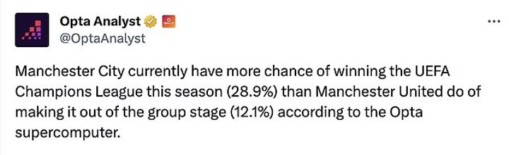 We aren't even at the start of December and Opta's Supercomputer has already calculated that Manchester City are more likely to go on and repeat their success of last season and win tournament than Man United are to make the last-16.