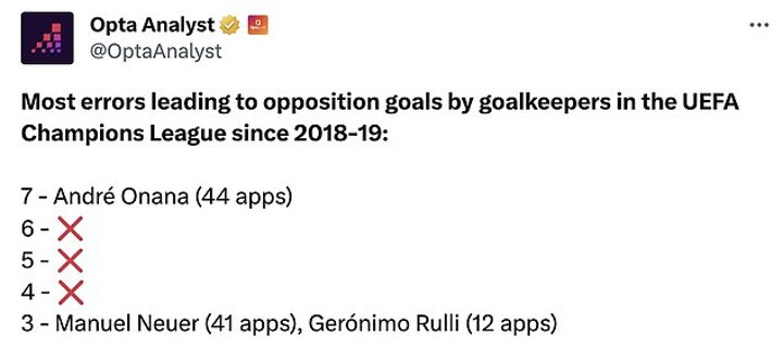 With two errors gifting Hakim Ziyech a brace on Wednesday night, Onana has now made seven errors which have led to goals in the Champions League since 2018-19.