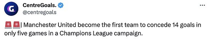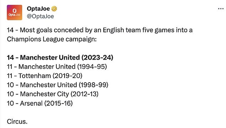 United's 14 goals shipped means they have conceded the most goals of any English team through five games in a Champions League... beating their own previous record.