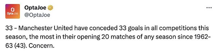 This is Manchester United's leakiest start to a campaign in. all competitions since they shipped 43 goals from their first 20 games in the 1962-63 season.
