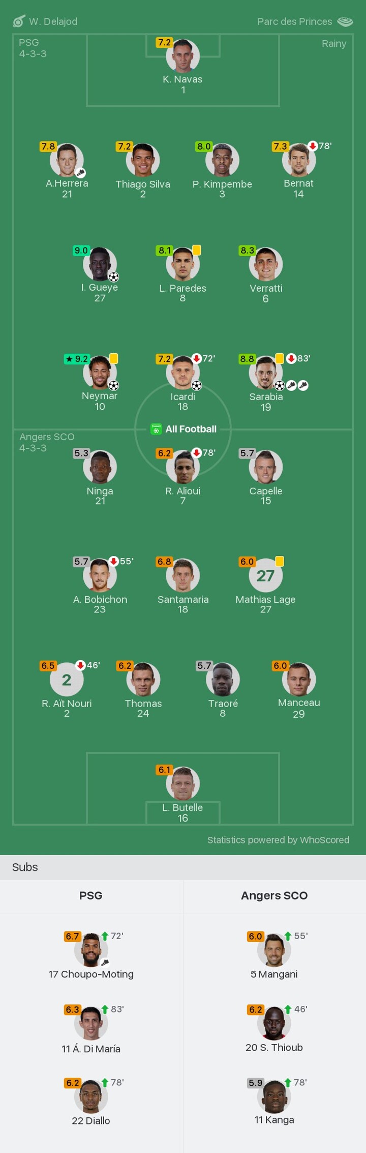 We bring you the player ratings for PSG vs Angers SCO as Neymar becomes Man of the Match with a rating of 9.2.