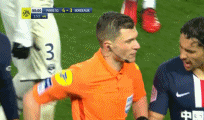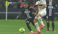 Neymar is sent off in stoppage time for a second bookable offence. He slides in late and hard on Adli and is given a yellow card then a red. He only has himself to blame after being booked in the first half for dissent.