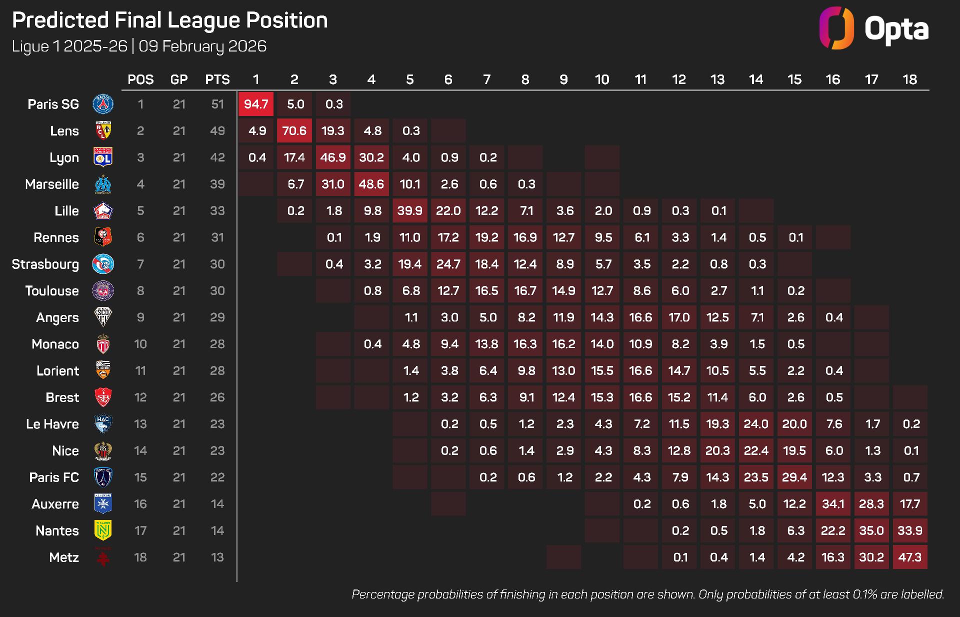 They succeed in 94.7% of the Opta supercomputer's simulations, with Lens' chances sitting at 4.9%. Lyon, who are now third, come out on top in the remaining 0.4%.