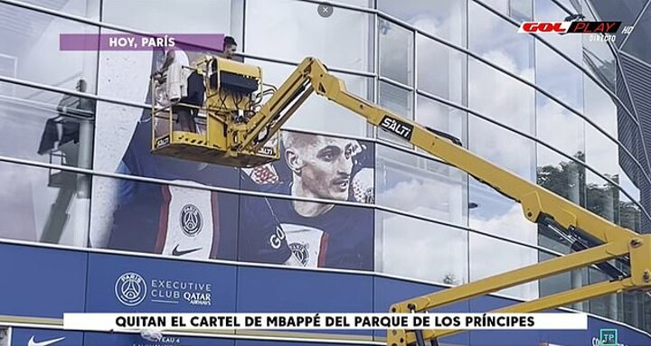 Footage then also showed construction workers taking down a large poster that featured on the side of the Parc Des Princes - which Mbappe was a part of.