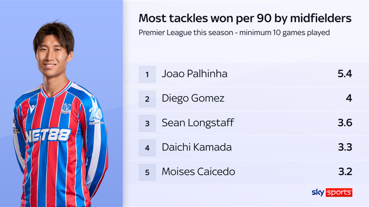 For Palace, the system works defensively as well as offensively. Kamada sits in the top five midfielders this season for tackles won per 90, with a slightly better record than Chelsea's Moises Caicedo.