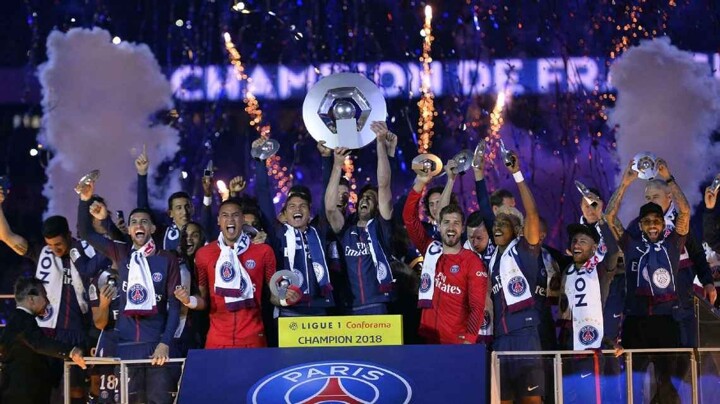 PSG celebrate their Ligue 1 title last season after their match against Rennes.