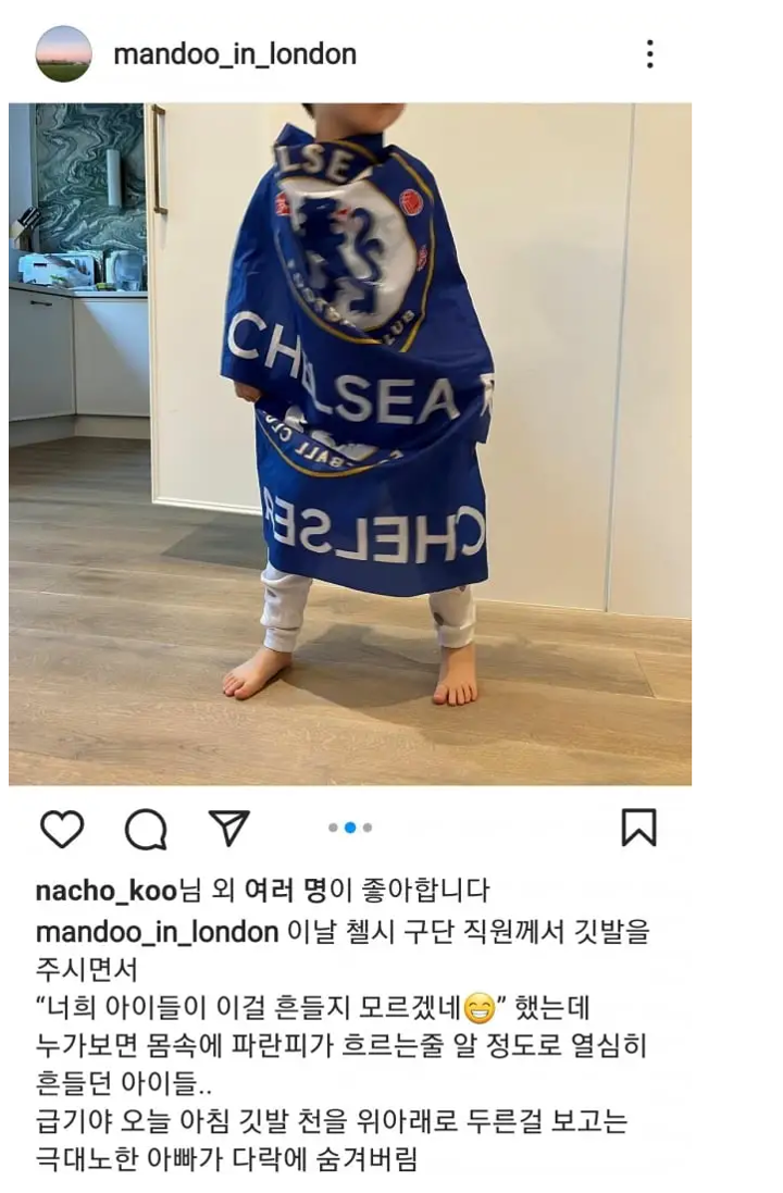 In the photo, Ji-Sung Park’s son waving the English Premier League (EPL) Chelsea flag or wearing them on top and bottom, respectively.