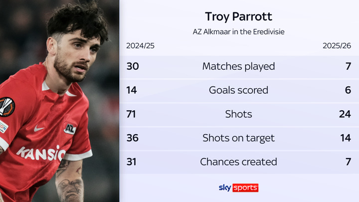 Parrott has kept up his standards with AZ. Last season, he scored 14 goals in 30 Eredivisie games - the league's third highest scorer. One of the highlights was four goals against Heerenveen in a 9-1 win in September 2024.