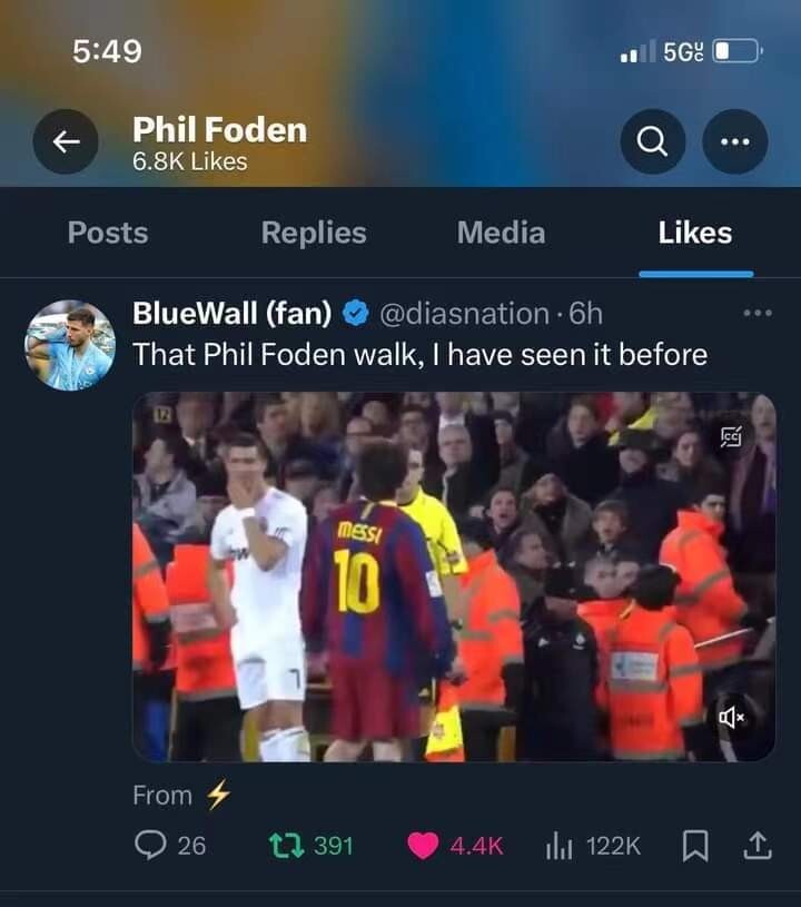 Phil Foden recently showed his approval by liking a tweet that compared his walk after being substituted out to Messi's iconic walk during the 5-0 Classico match. It seems like Foden is embracing the comparison to the legendary player.
