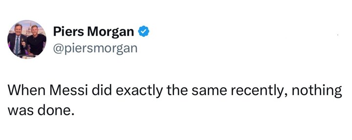 After Cristiano Ronaldo was sent off with a red card for an elbowing foul, Morgan posted a video of Messi playing on social media, stating that "When Messi did exactly the same recently, nothing was done."