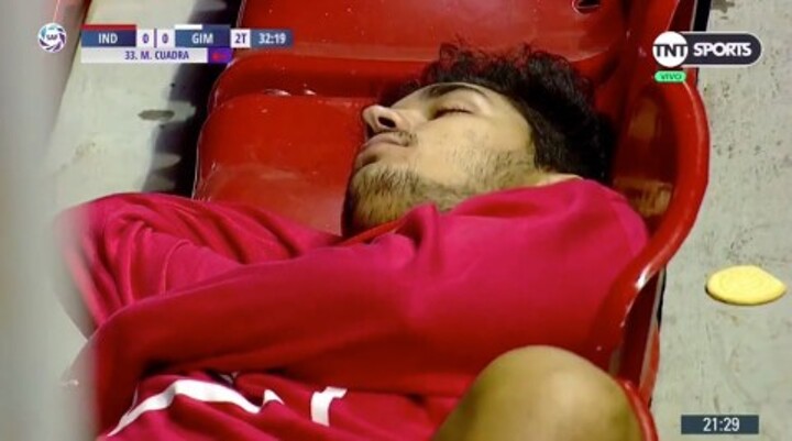 Moments after being subbed, the camera pans to Dominguez lying across the bench with his eyes shut and his arms crossed.