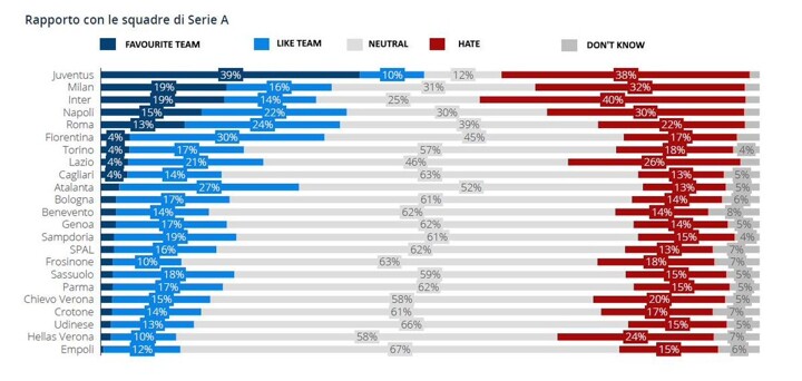 By combining a favourite team with a team you like, the poll reveals that Juventus has the highest sympathizers at 49%, followed by Napoli and Roma, each with 37%. The other clubs that follow are Milan (35%), Fiorentina (34%), Inter (33%) and Atalanta (31%) at the top of the class in this combined classification.