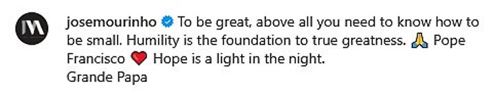 Legendary football coach Jose Mourinho also offered a touching tribute to the late Pope, taking to Instagram to share a picture of Francis along with a message.
