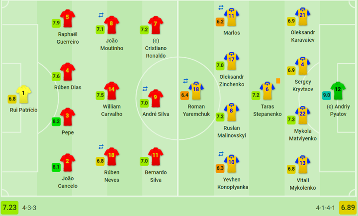 Portugal XI: Cristiano Ronaldo, Pepe, Rui Patrício, João Moutinho, William Carvalho, Cancelo, Raphaël Guerreiro, André Silva, Rúben Neves, Rúben Dias, Bernardo Silva