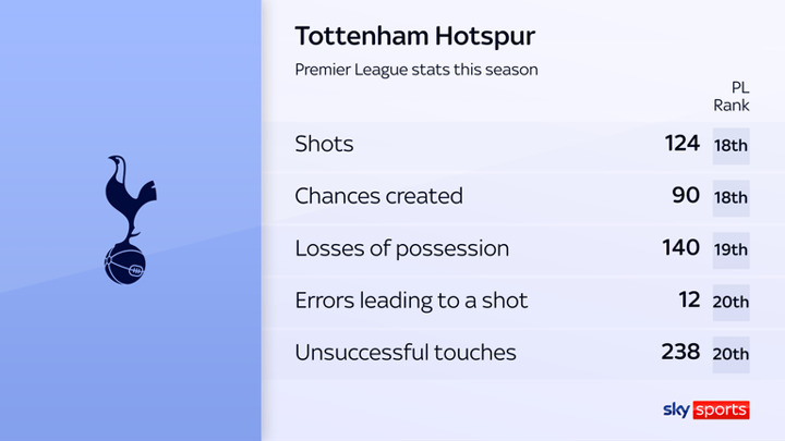 Spurs are in the bottom three in the Premier League this season for shots and chances created, while only one Premeir League team has given the ball away more times. They have also made a league-high 12 errors leading to a shot.