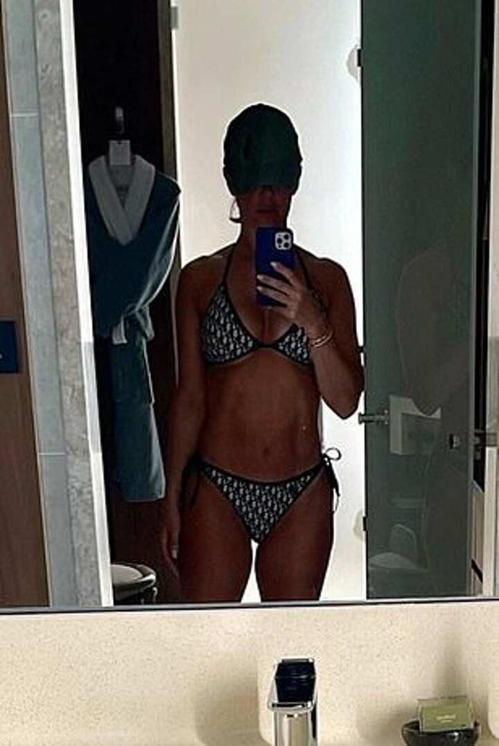 The WAG wowed in a Dior print bikini in one social media snap as she posed for a mirror selfie wearing a cap.