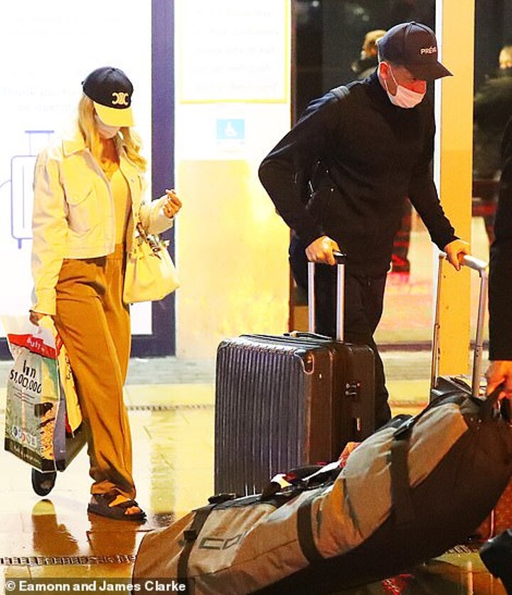 Newlywed Taylor Ward showed off her curves in a cropped T-shirt and tracksuit bottoms and she and Riyad rolled their Louis Vuitton cases by their sides.