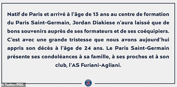 It read: 'A Paris native who arrived aged 13 at Paris Saint-Germain's academy, Jordan Diakiese left only good memories with his coaches and his team-mates.