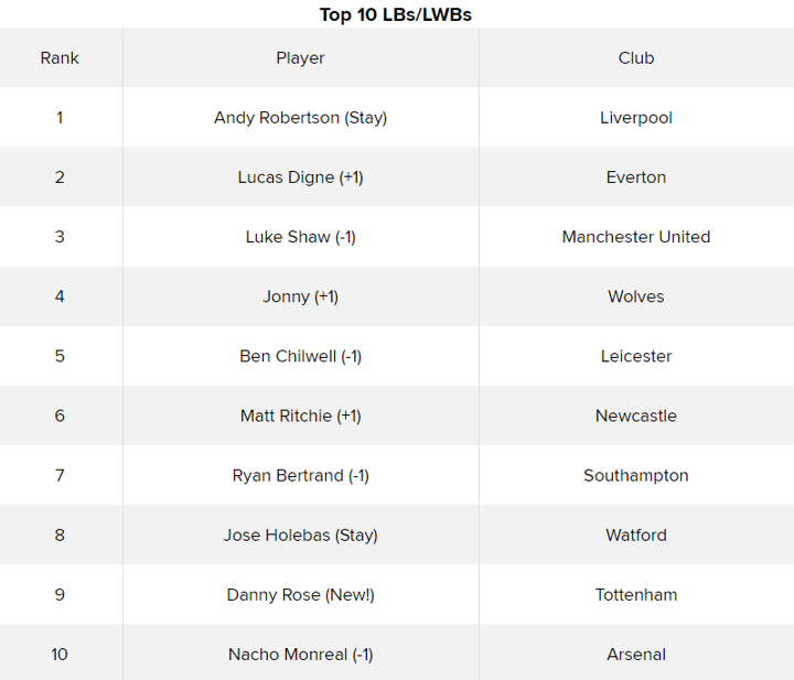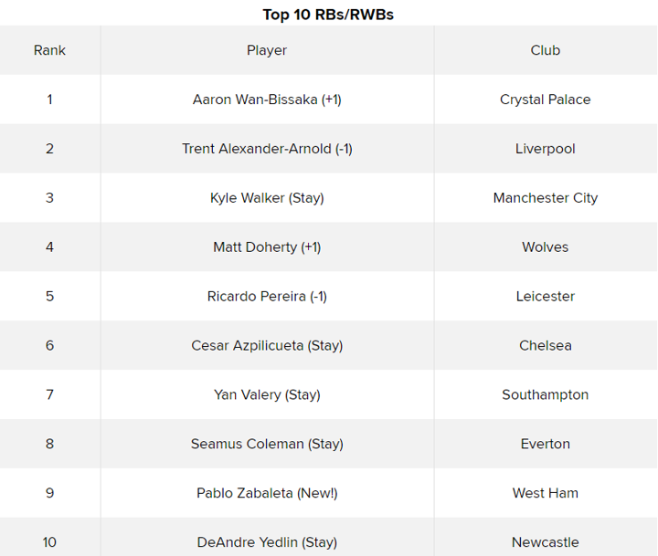 You won't find the same concerns around Aaron Wan-Bissaka, who doesn't have the assist tally that Trent boasts but is arguably the best defensive right-back in the league now—and even excelled at left-back against Arsenal last weekend. He jumps in at No. 1.