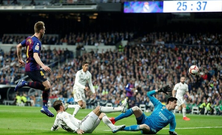 Goal! Real Madrid 0, Barcelona 1. Ivan Rakitic (Barcelona) right footed shot from the right side of the box to the centre of the goal. Assisted by Sergi Roberto with a through ball.