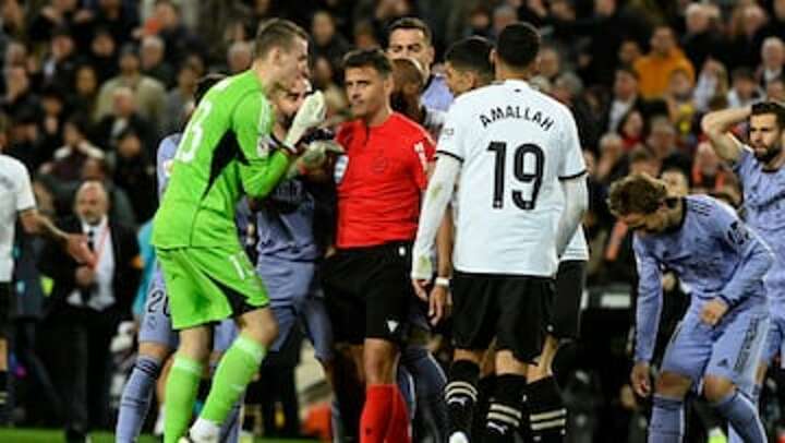 Brahim broke down the wing and lofted the ball into the heart of the box, at which point Gil Manzano blew his whistle as Bellingham headed past Mamardashvili. But the final whistle was blown a split-second before the goal, so it was not added to the scoreboard, provoking a strong reaction from the Real Madrid players.